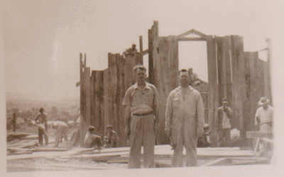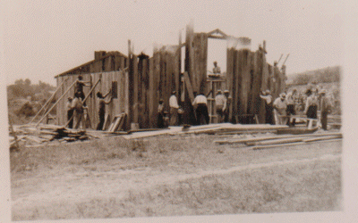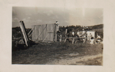 About thirty men helped either part of the day or all day. The ladies of the churches furnished the noonday meal, and so much food was brought it was found there was enough left to serve supper on the grounds. It was a bright sunny day and there was an air of excitement and satisfaction among the workers. At dusk, the new part of the building was completed with the exception of putting roofing over the sheathing. Lights were installed and a few benches were brought in.